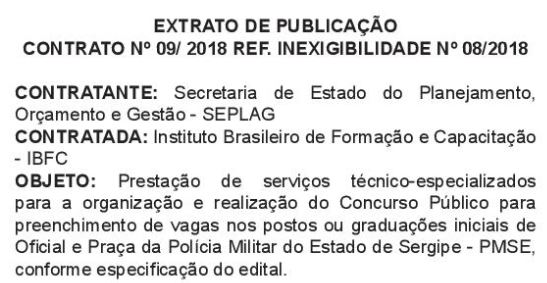 A Secretaria de Estado de Planejamento e Gestão de Sergipe (Seplag) já havia publicado a comissão organizadora do certame e escolhido a banca responsável pela realização do certame. Nesta semana, 19 de março, publicou o extrato de contrato com a banca IBFC, por meio de inexigibilidade, para o Concurso PM SE e Concurso Bombeiro SE.