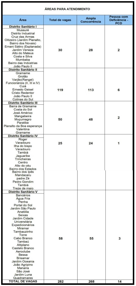 No caso de agente comunitário, os candidatos também devem residir na área de abrangência da unidade em que pretendem atuar. As vagas estão distribuídas entre cinco distritos sanitários.